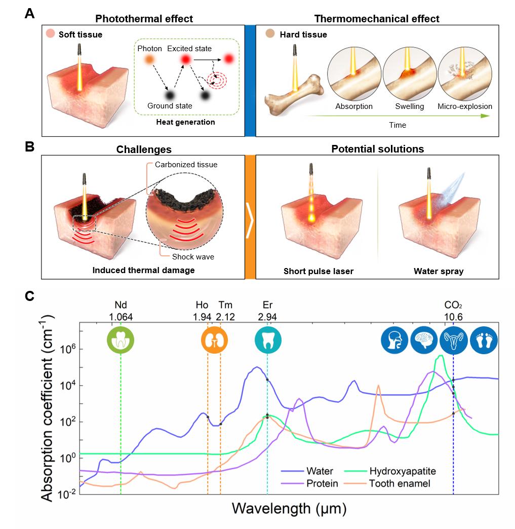 Unlike traditional surgical tools based on mechanical processing, laser surgical knives achieve efficient biological tissue processing through their unique tissue optical effects. The article elaborates on the mechanisms of photothermal ablation and photomechanical ablation for soft and hard tissue resection, and discusses the research progress of water mediated and ultra short pulse laser technology in alleviating thermal damage such as tissue condensation and carbonization (Figure 1). Furthermore, the article analyzes the characteristics, advantages, and application value of infrared medical light sources mainly composed of Nd, Ho, Tm, Er, and CO2 lasers in various surgical fields such as dentistry and urology, and emphasizes the significant challenges that the advancement of new surgical laser light source technology brings to the flexibility, stability, and controllability of laser transmission media.