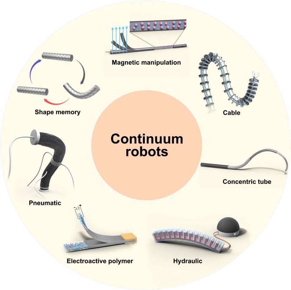 The precise control of surgical instruments is an important factor in achieving efficient and minimally invasive surgery. The rapid development of materials science and bioengineering disciplines has given rise to research on continuum surgical robots with diverse driving methods, promoting the development of precision surgical medicine. The article comprehensively analyzes the driving mechanism and characteristics of existing continuum robots (Figure 3), pointing out the enormous potential of continuum robots based on magnetic driving in safe, accurate, and intelligent surgical interventions. In addition, the article further proposes the concept of flexible fiber robot laser surgical knives. The combination of laser surgical knives and medical continuum robots has promoted their wider clinical applications. These systems have been successfully applied in urology, gynecology, and otolaryngology surgeries.
