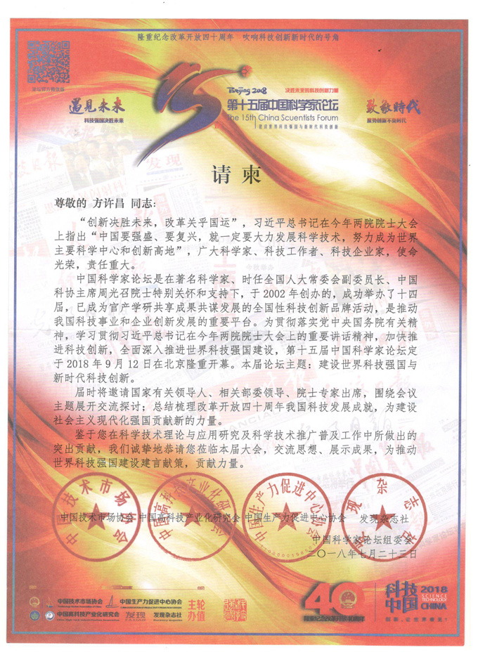 隆重紀念改革開放40周年第十五屆中國科學家論壇將于2018年9月12-13號在北京隆重召開,深圳市御嘉鑫五金制品有限公司董事長、總經(jīng)理方許昌先生,也將受邀參加此次中國科學家論壇!同各界人士一道,交流思想、展示成果,積極為中國科學創(chuàng)新事業(yè)的發(fā)展貢獻出自己的力量。
